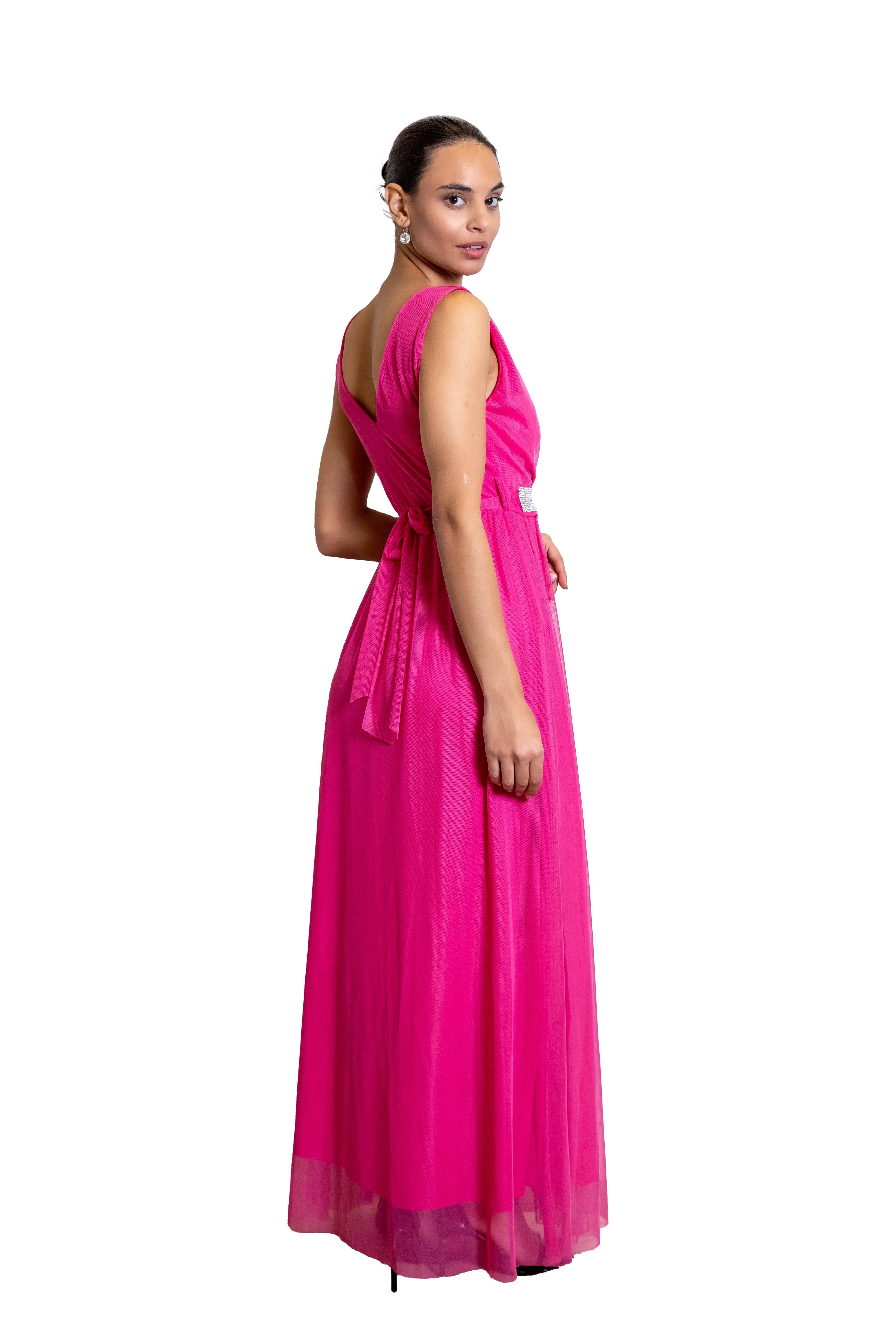 Φόρεμα Φουξ Μάξι Με Τούλι Και Ζωνάκι Στρας