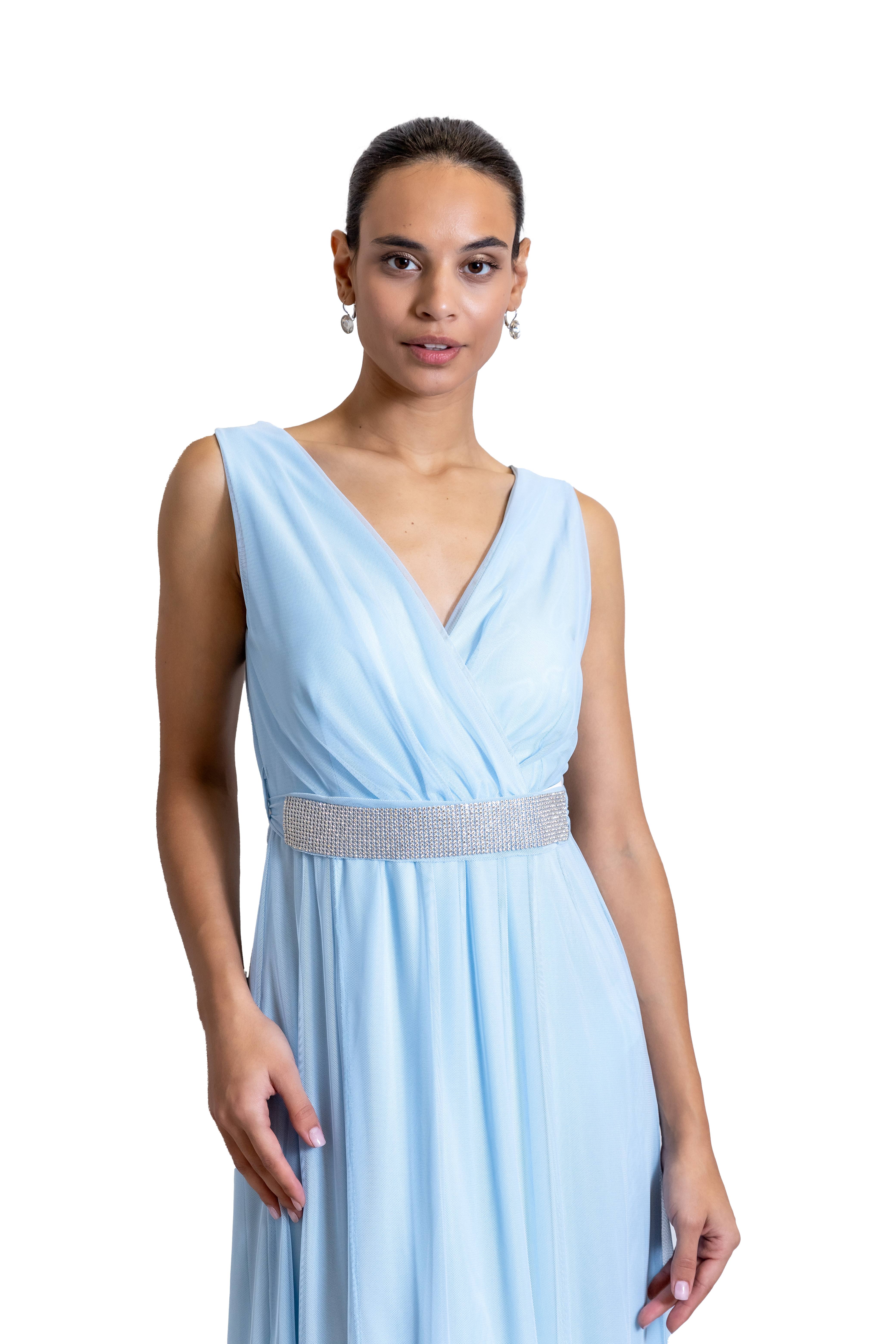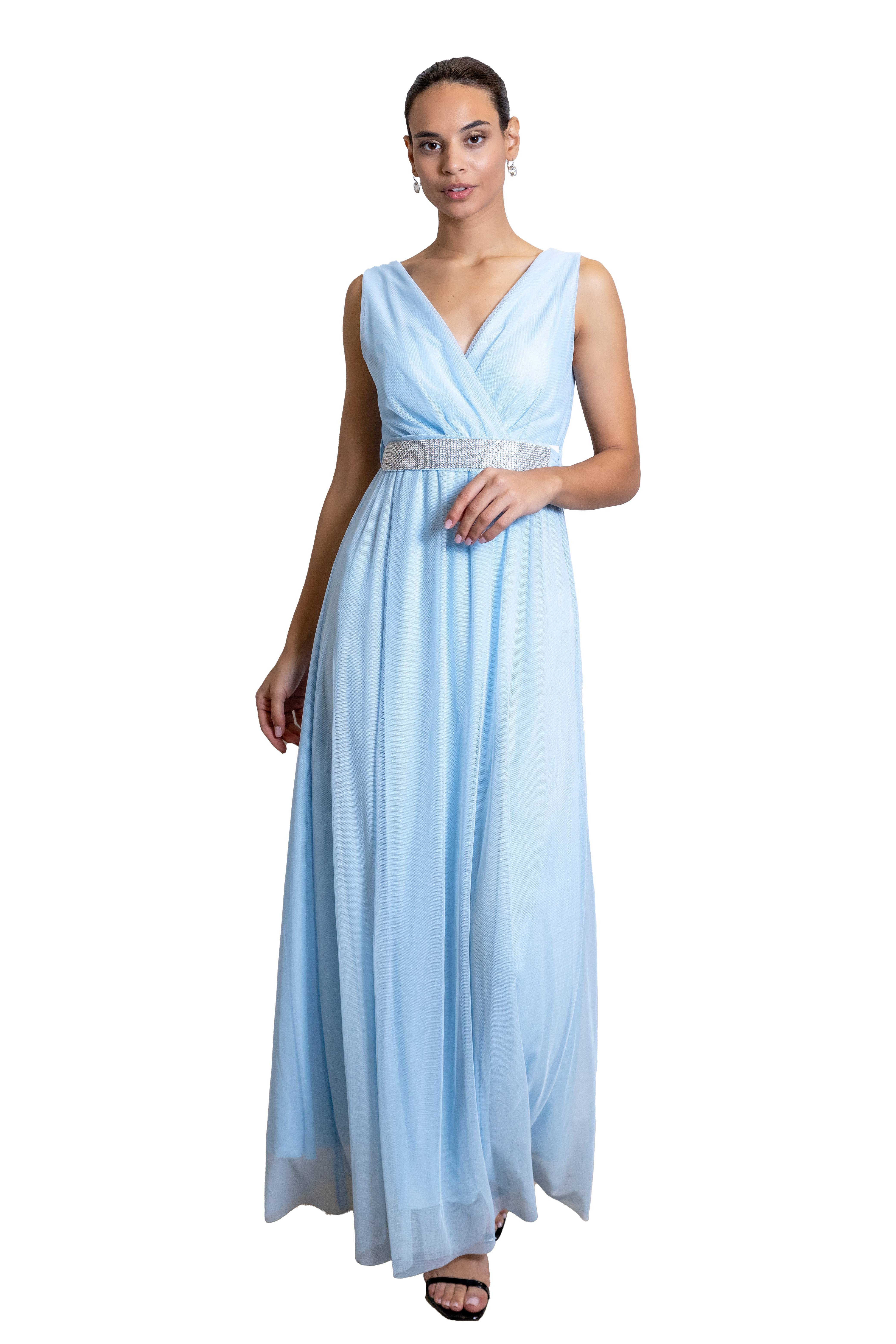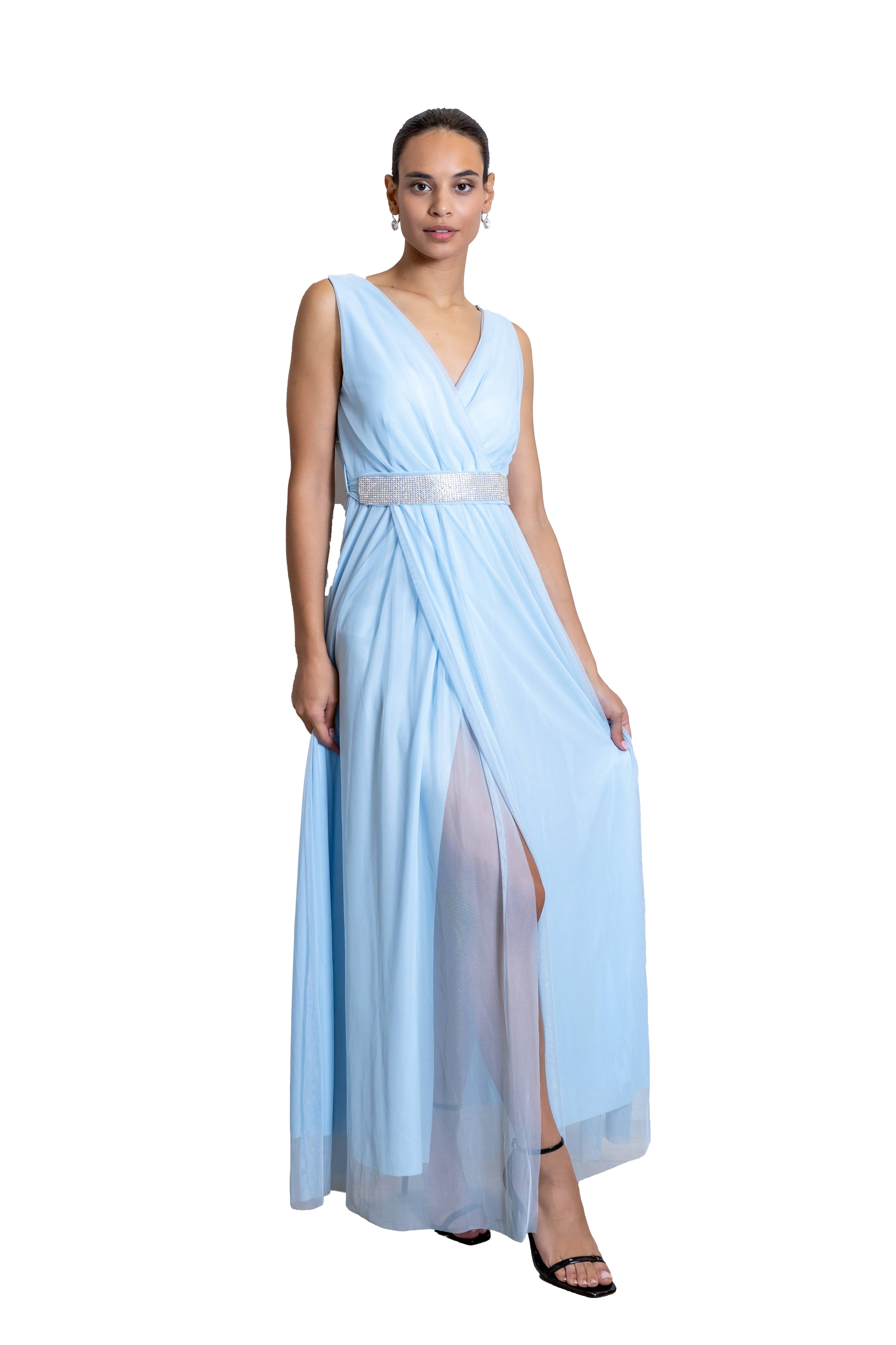 Φόρεμα Γαλάζιο Μάξι Με Τούλι Και Ζωνάκι Στρας