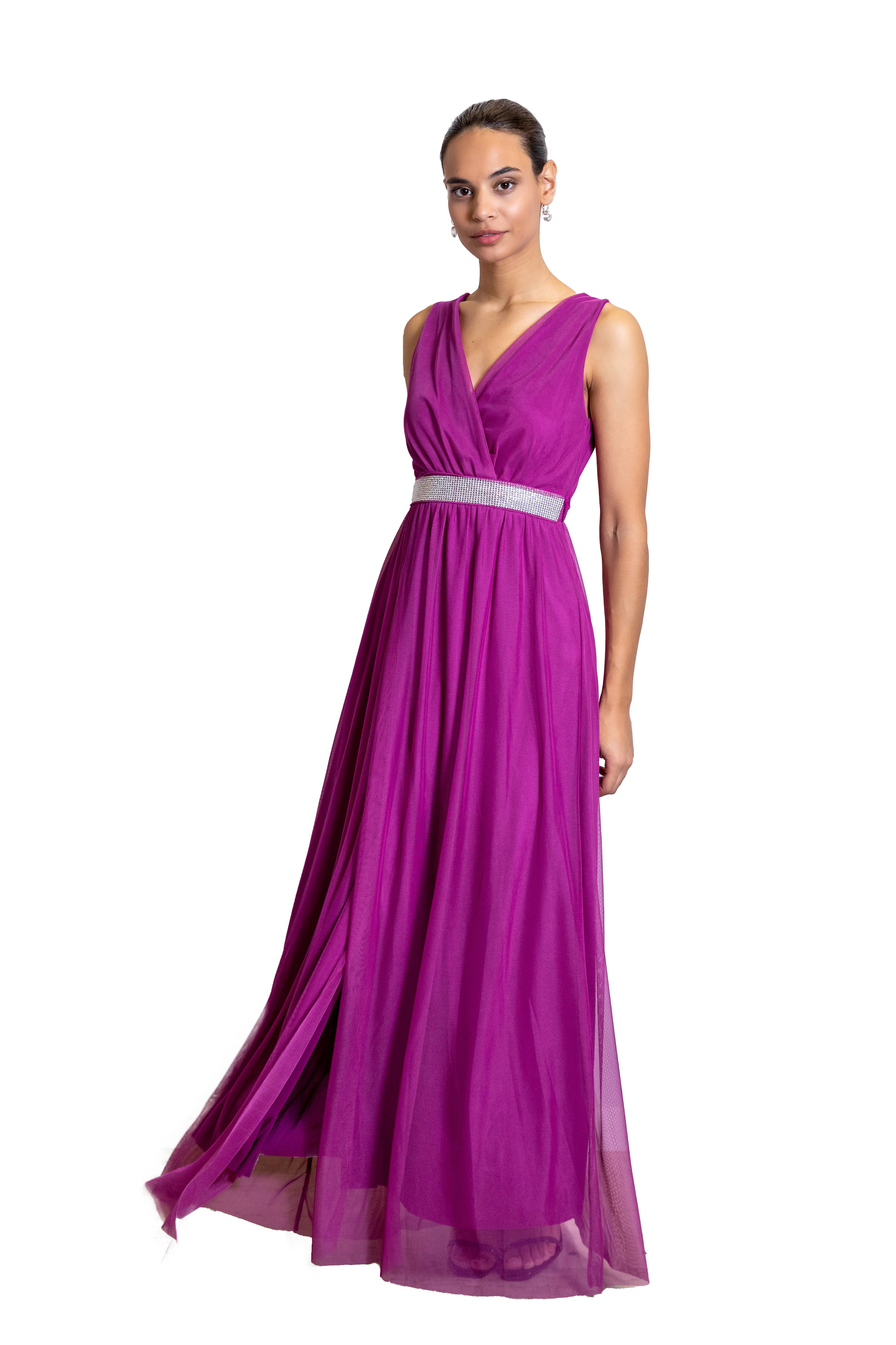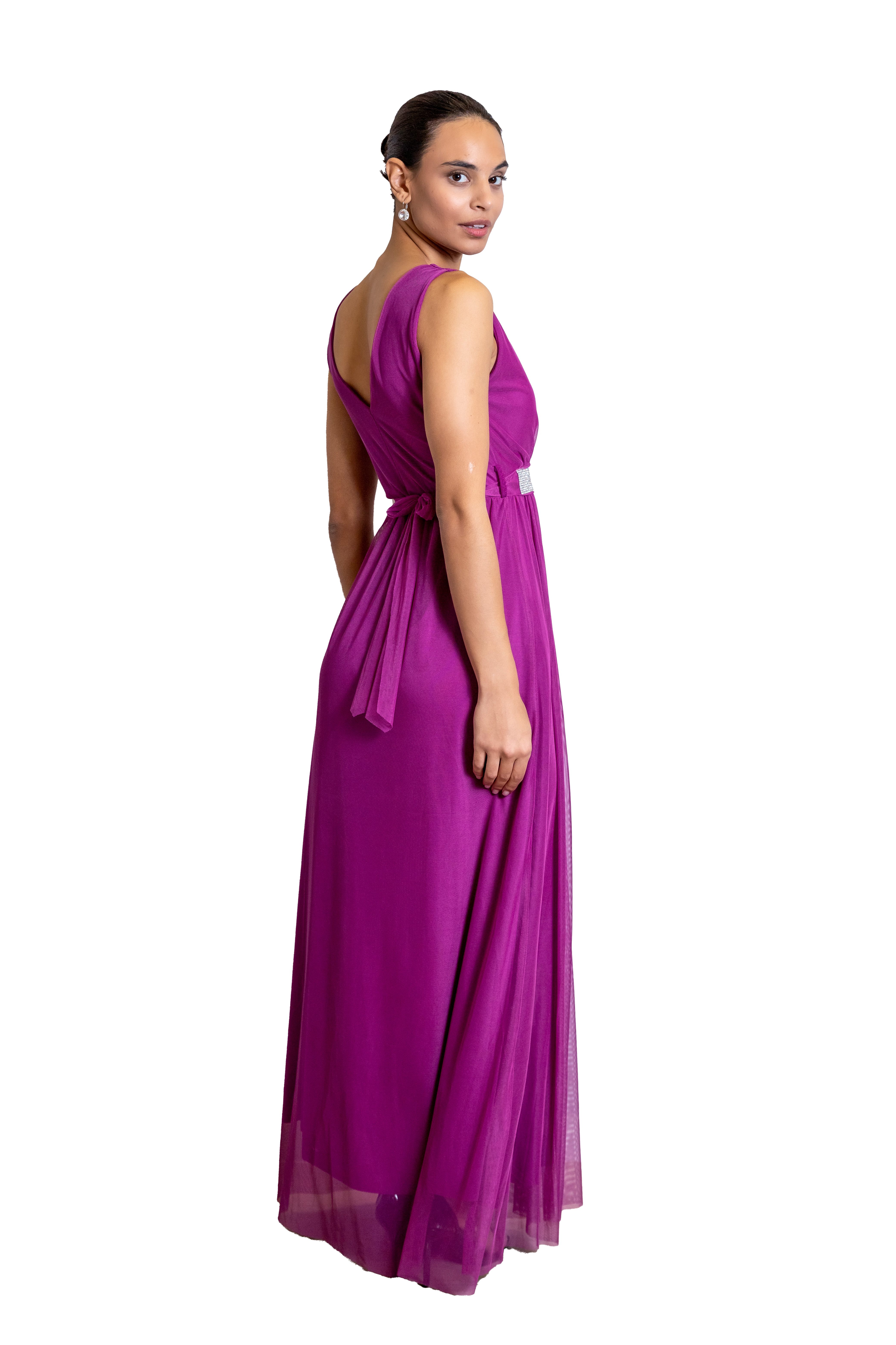 Φόρεμα Ματζέντα Μάξι Με Τούλι Και Ζωνάκι Στρας