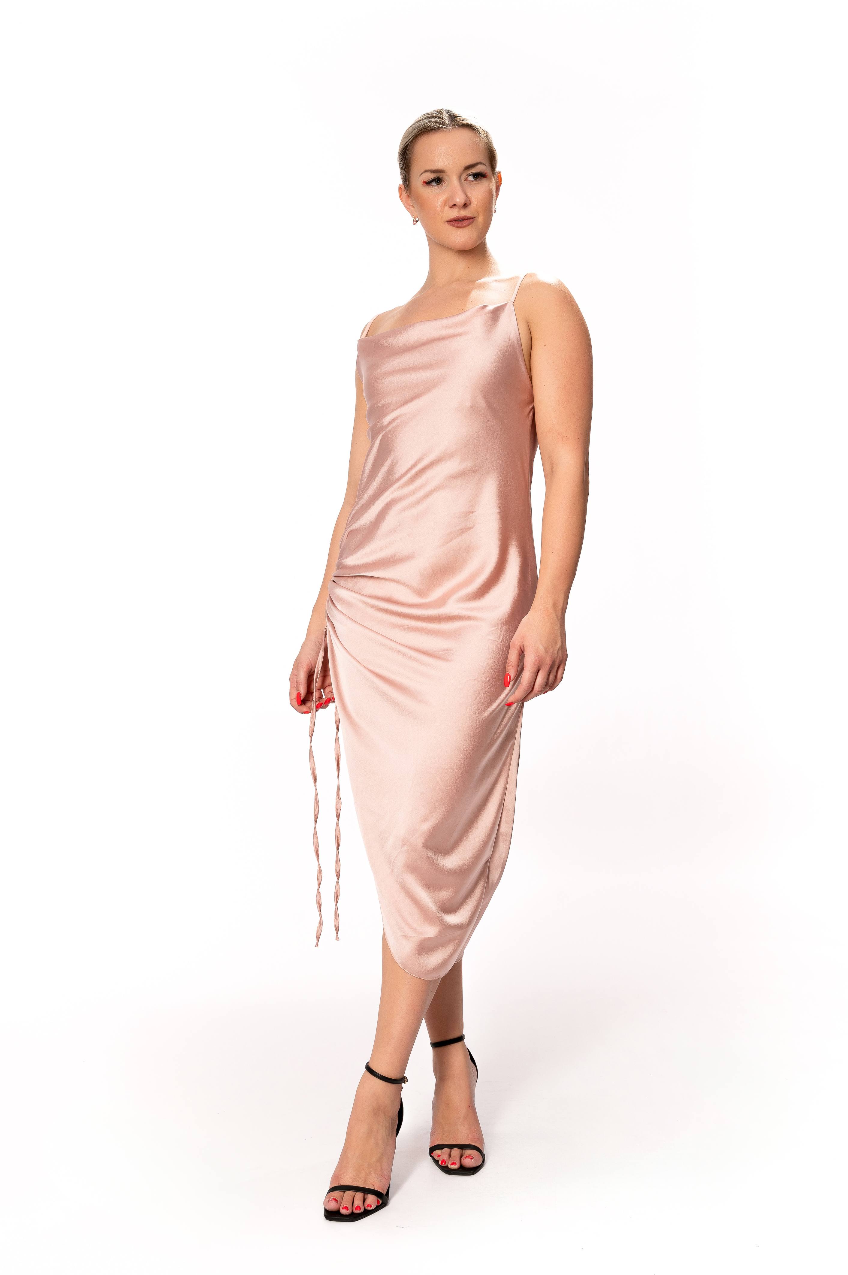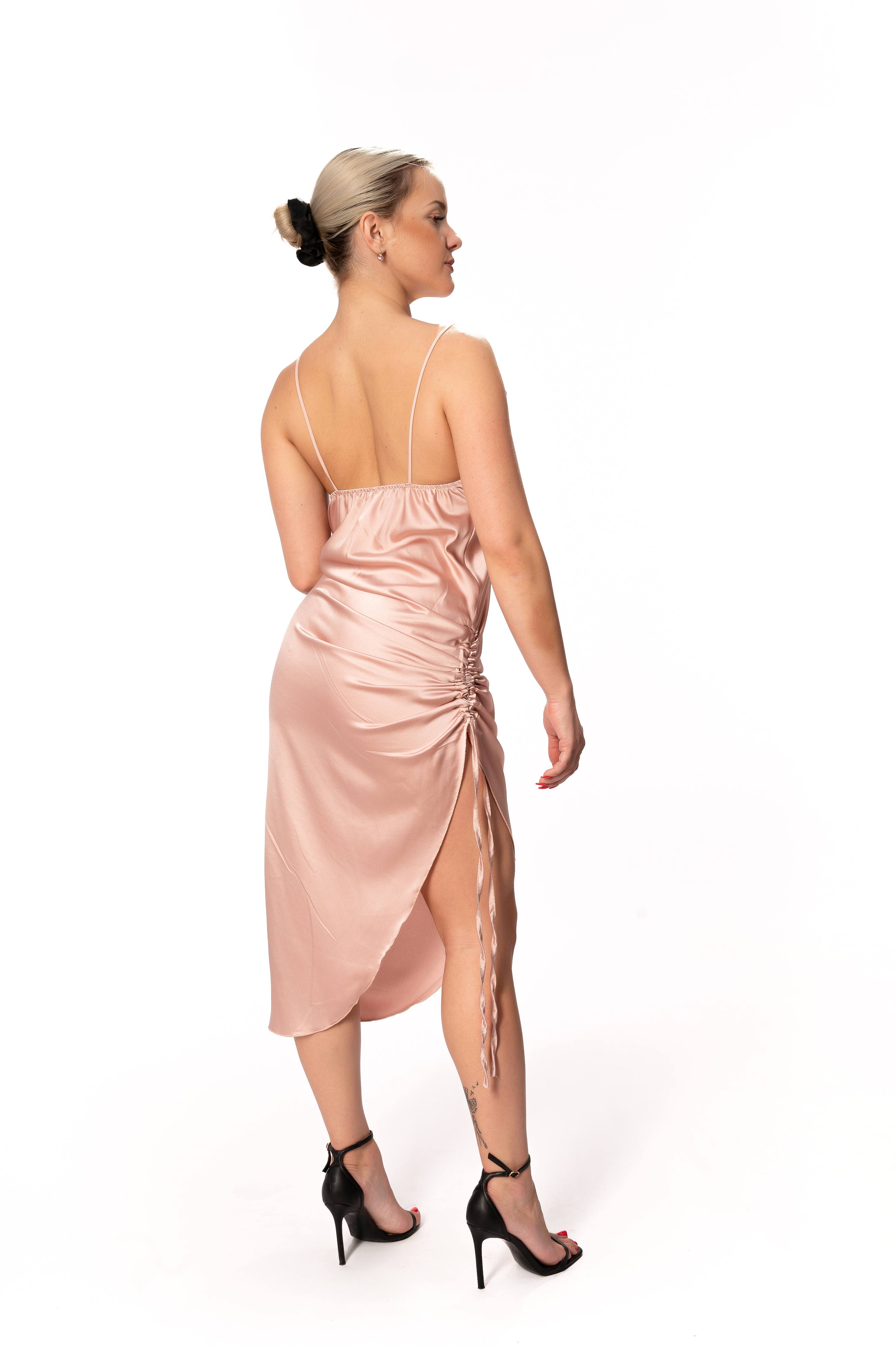 Φόρεμα Σατέν Ροζ Με Σούρες